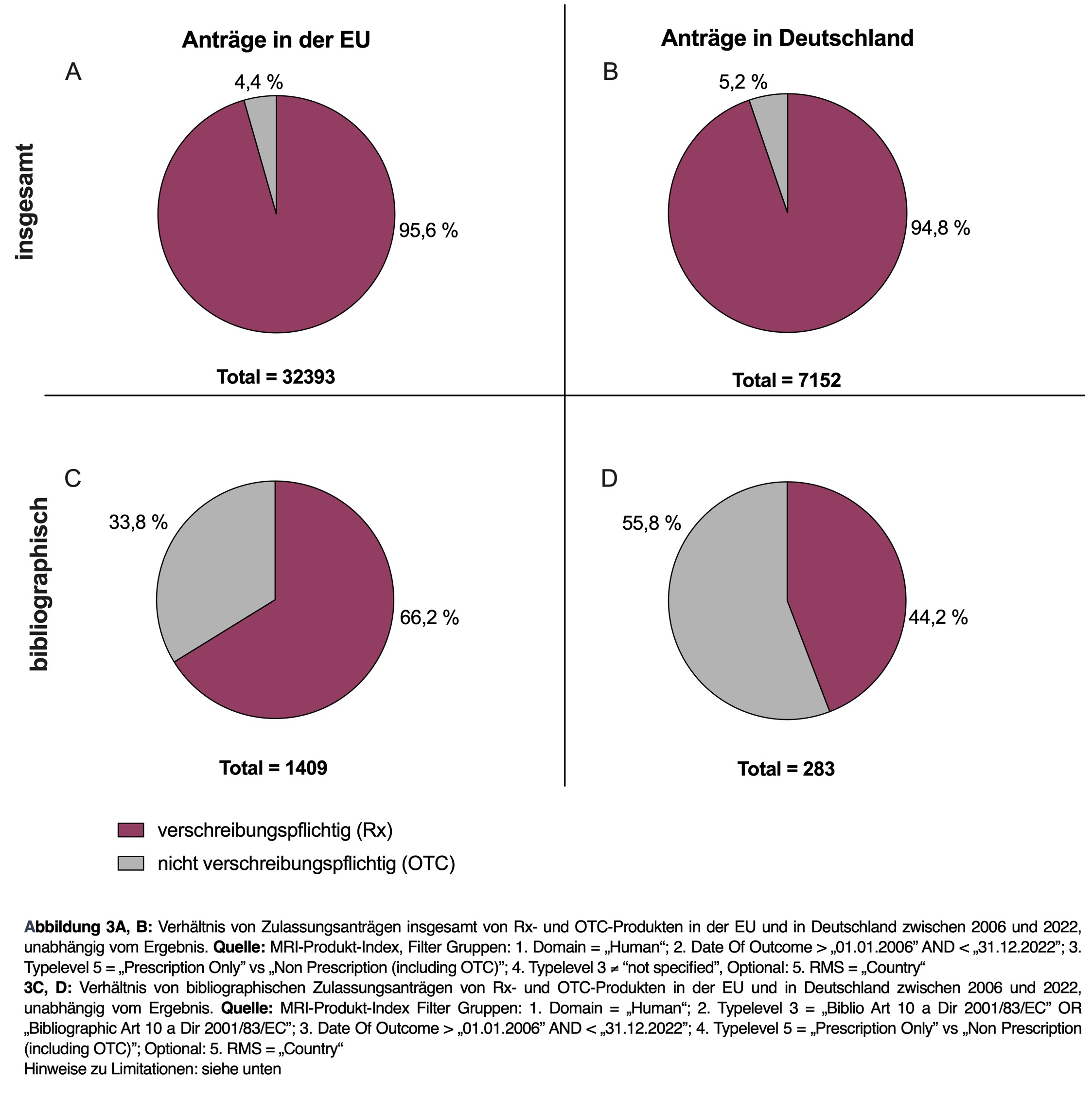 When comparing all marketing authorization applications for prescription (Rx) and non-prescription (OTC) medicinal products between 2006 and 2022 in the EU only 4.4 % of the more than 32,000 applications were submitted for OTC products (see Figure 3A). This trend is consistent when considering marketing authorization applications submitted in Germany in isolation, where the ratio is comparable at 5.2 % for OTC products (refer to Figure 3B).
